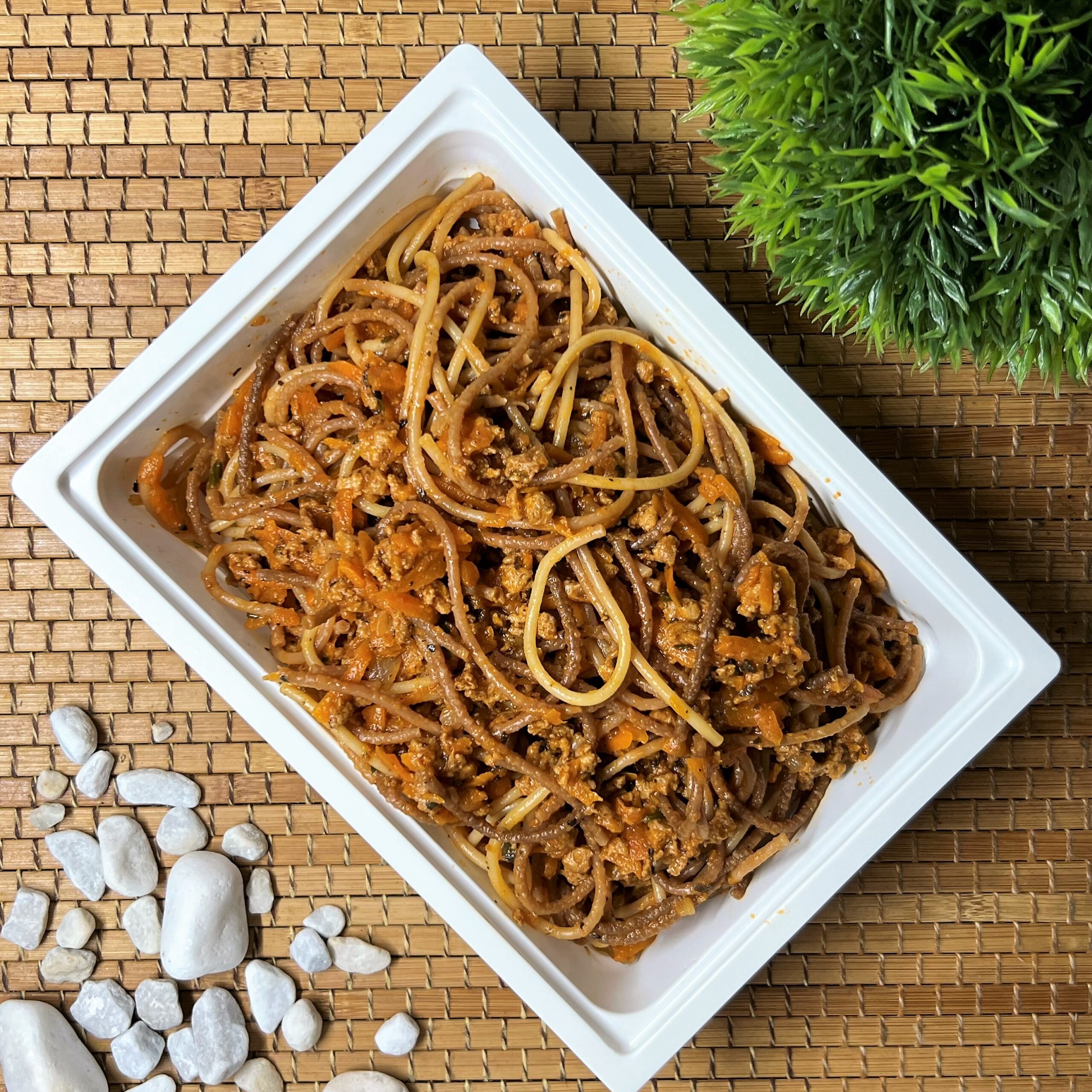 Tönköly spagetti, szója, sárgarépa, paradicsom, fűszerek.