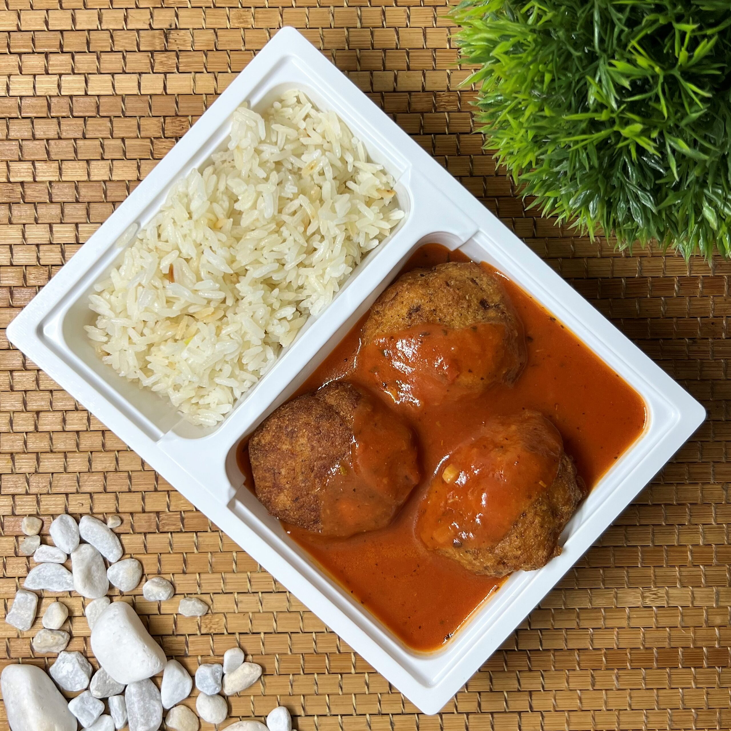 Brokkolis, burgonyás fasírtgombóc fűszeres paradicsomszószban, jázmin rizzsel