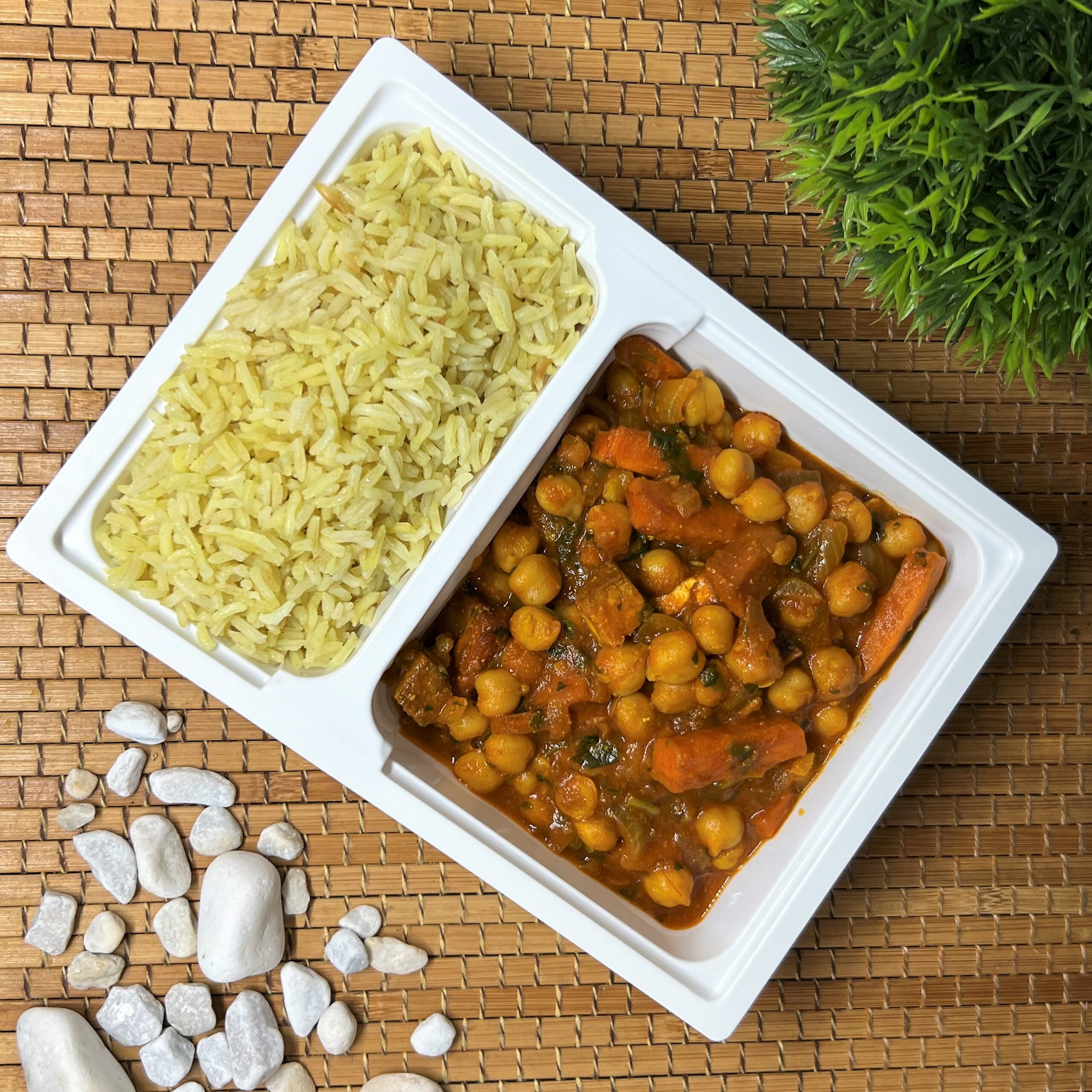 Csicseriborsó, sült tofu, vöröshagyma, fokhagyma, gyömbér, paradicsom, sárgarépa, fűszerek, basmati rizs, citrom.