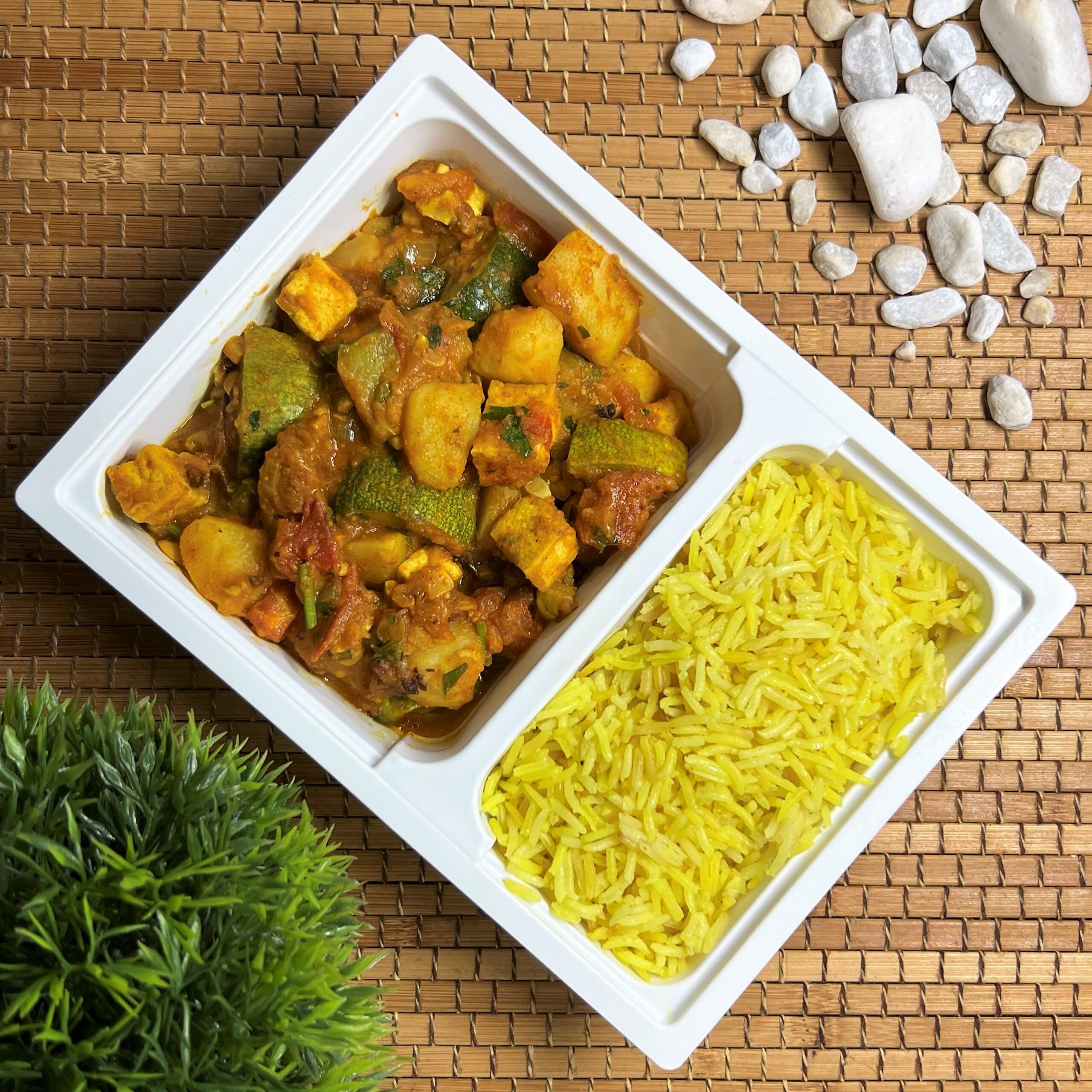 Cukkini, karfiol, burgonya, sült tofu, paradicsom, darált kesudiót. citrom, basmati rizs, fűszerek.