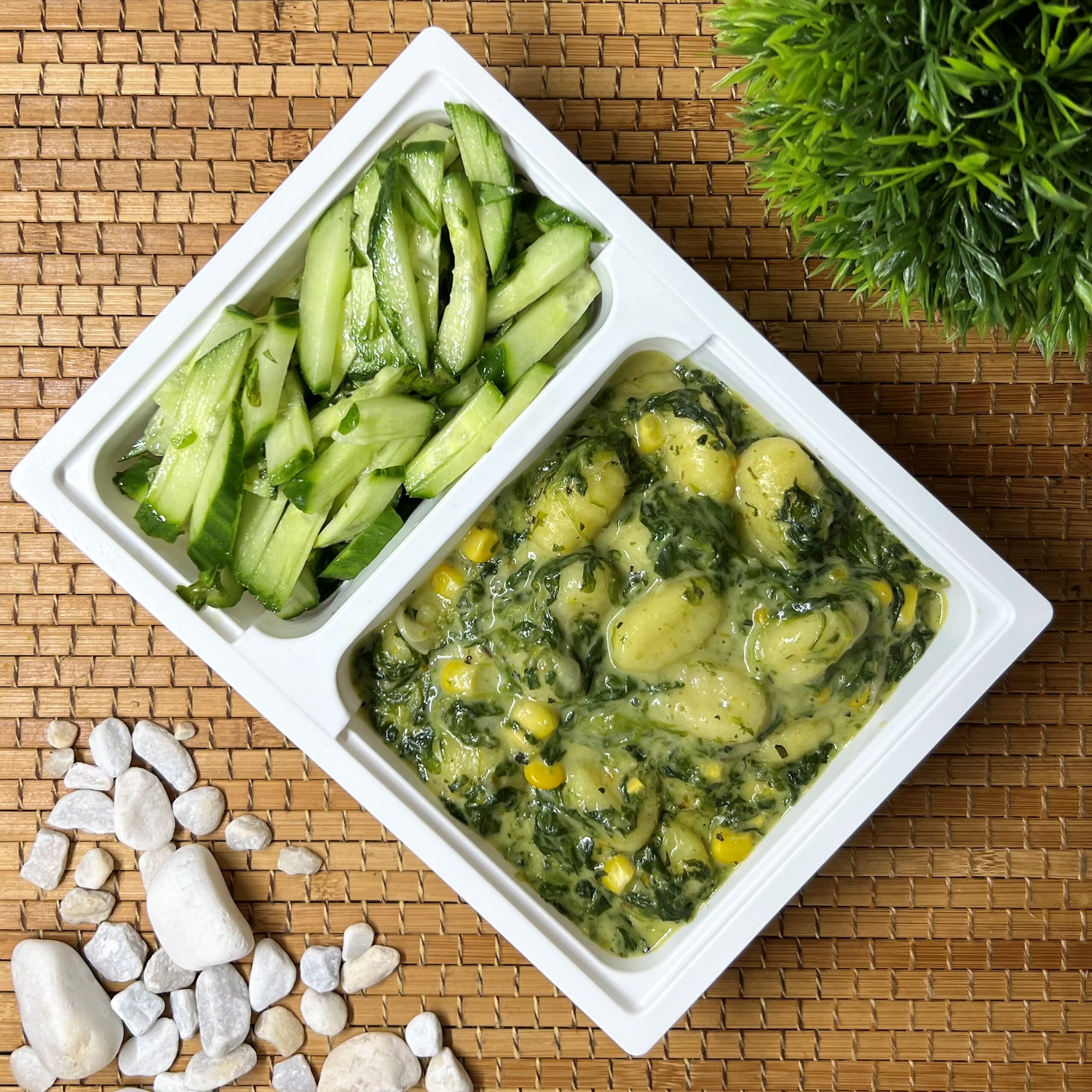 Gnocchi, spenót, vegán sajt, kókusztejszín, kukorica, uborka, bazsalikom, fűszerek.