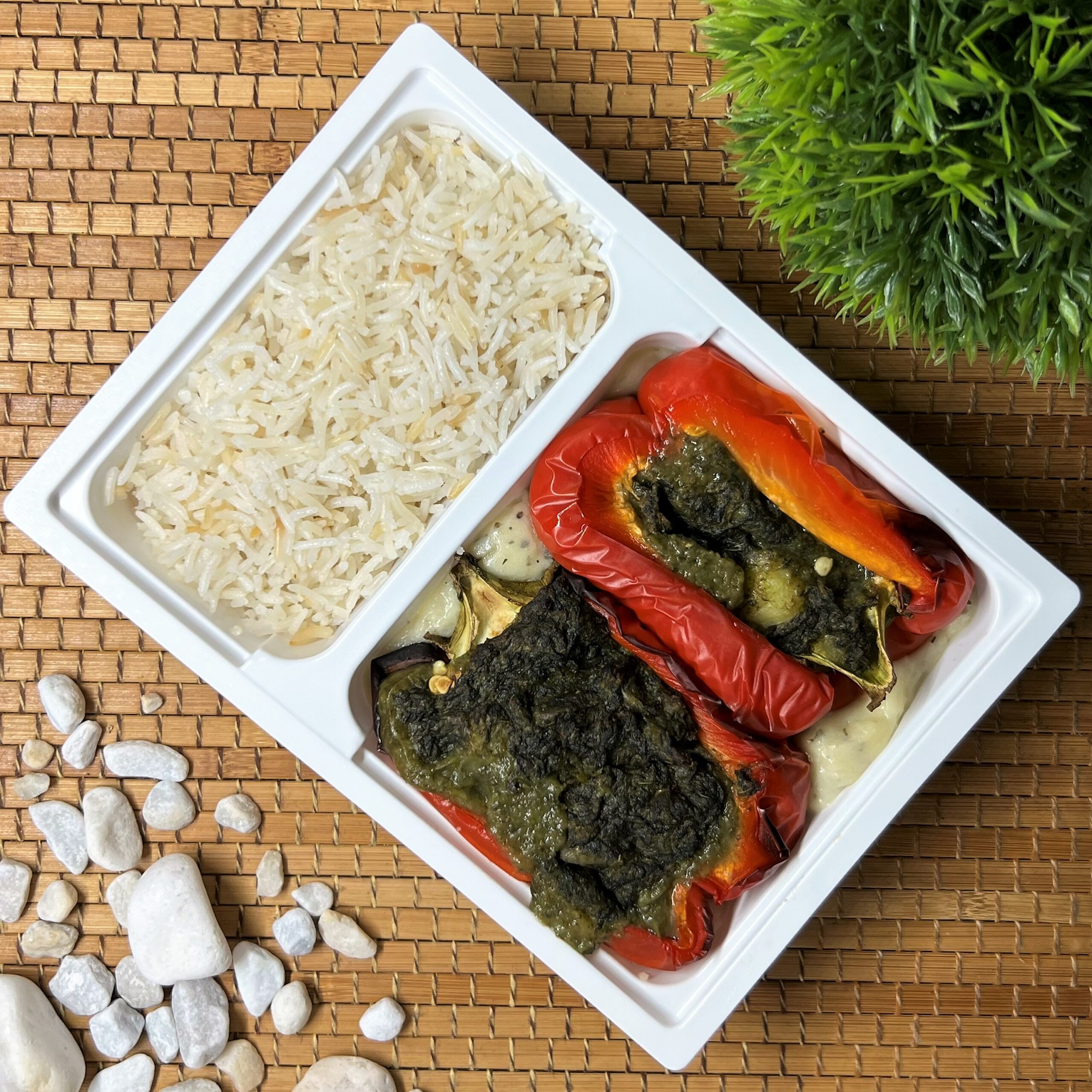 Kaliforniai paprika, spenót, burgonya, vegán sajt, kókusztej, basmati rizs, fűszerek.