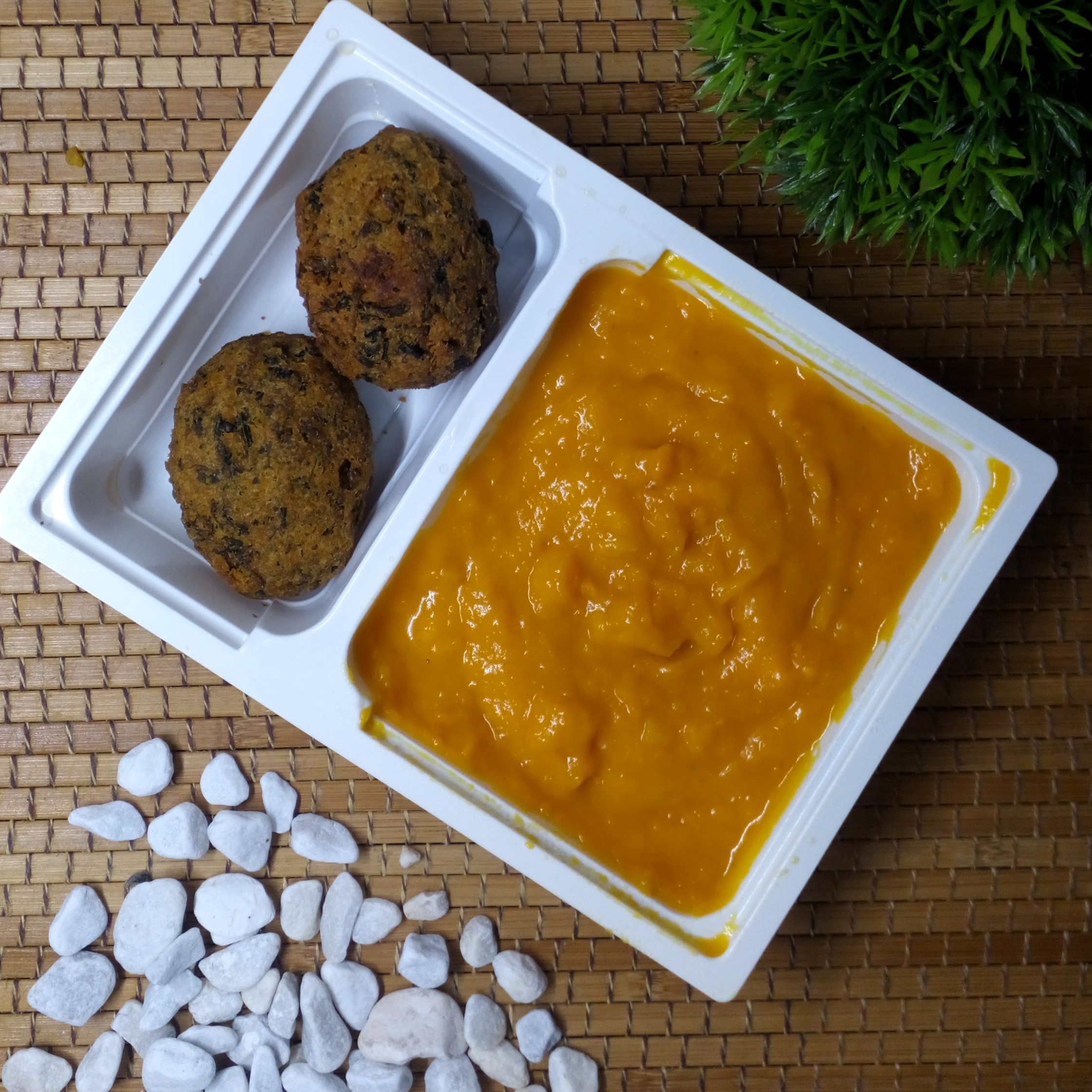 Sütőtök, édesburgonya, kókusztej, fűszerek. Spenót, répa, sárgaborsó, lencse, rizsliszt, fűszerek.