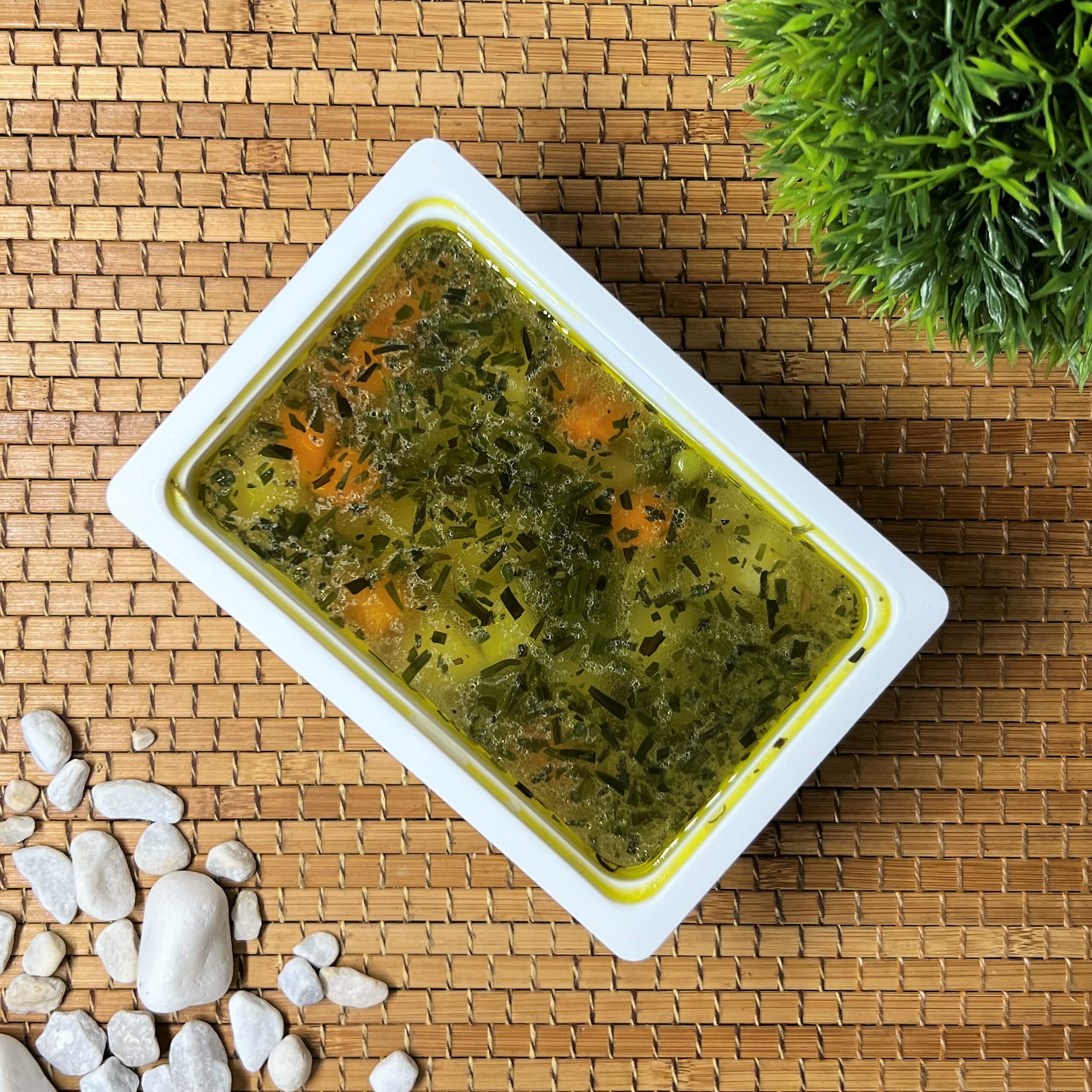 Zöldborsó, sárgarépa, fehérrépa, zeller, burgonya, fűszerek.